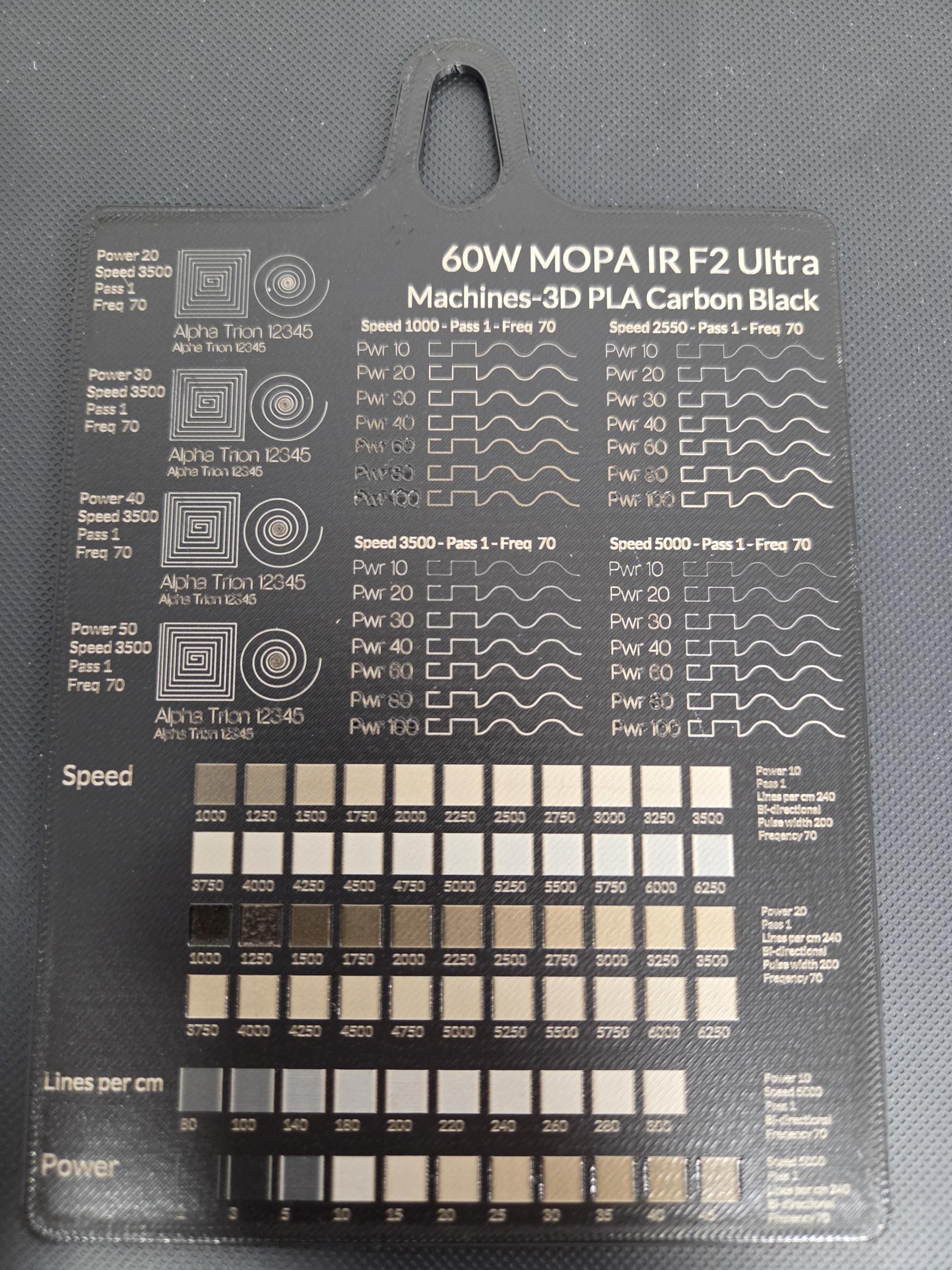 Il a ensuite été gravé sur la xTool F2 Ultra. Les paramètres de gravure sont très dépendants du filament précis utilisé, nottament de la couleur. Voici les paramètres pour le filament utilisé (PLA Carbon Black) :
