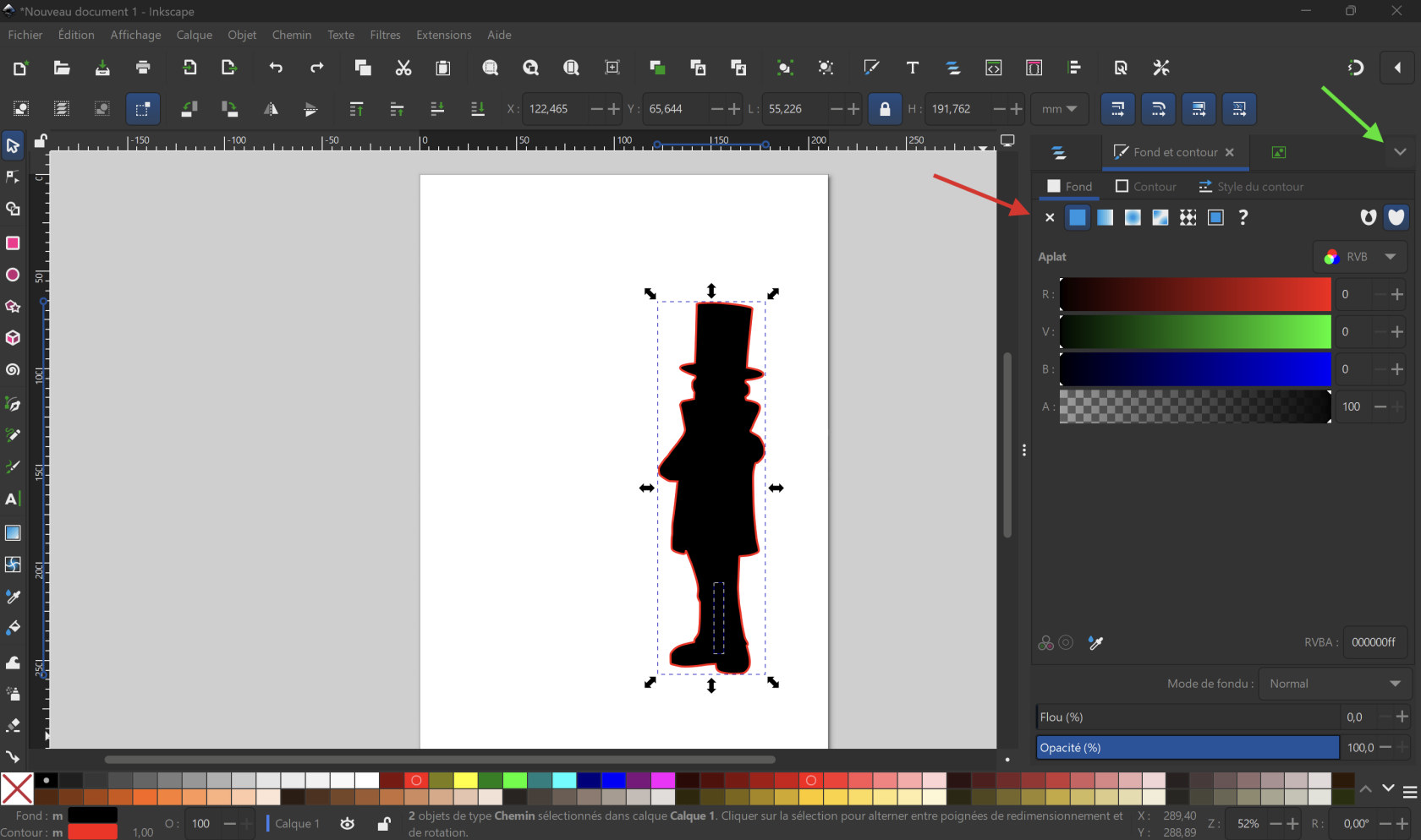 Si vous n'arrivez pas à sélectionner les éléments à cause de la silhouette, déplacée la sur le coté, sélectionnez la silhouette et les autres éléments, puis appuyez sur Crtl + Z pour bien réaligner les éléments.