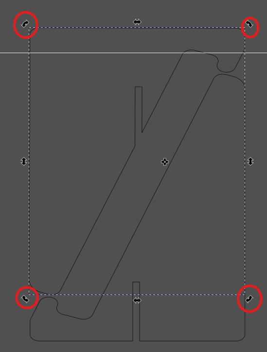 Pour faire pivoter un objet sur Inkscape, il suffit de cliquer dessus une seconde fois après l'avoir sélectionné. Cela fait apparaitre dans les coins les outils nécessaires à la rotation.