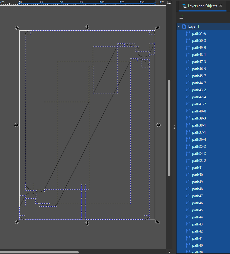 Il nous reste un problème à traiter : lors de l'importation d'un DXF dans Inkscape, les formes sont constituées de plein de petits chemins, ce qui pose problème lors de la découpe (chaque petit chemin est découpé individuellement, plutôt qu'en un seul chemin continu pour une forme).